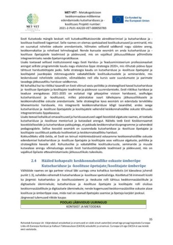 ja -koolituse õpetajate ja koolitajate teadmiste ja pädevuse suurendamiseks. Eesti riiklikus hariduse ja